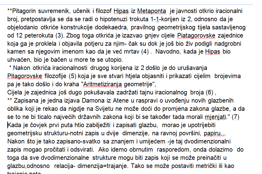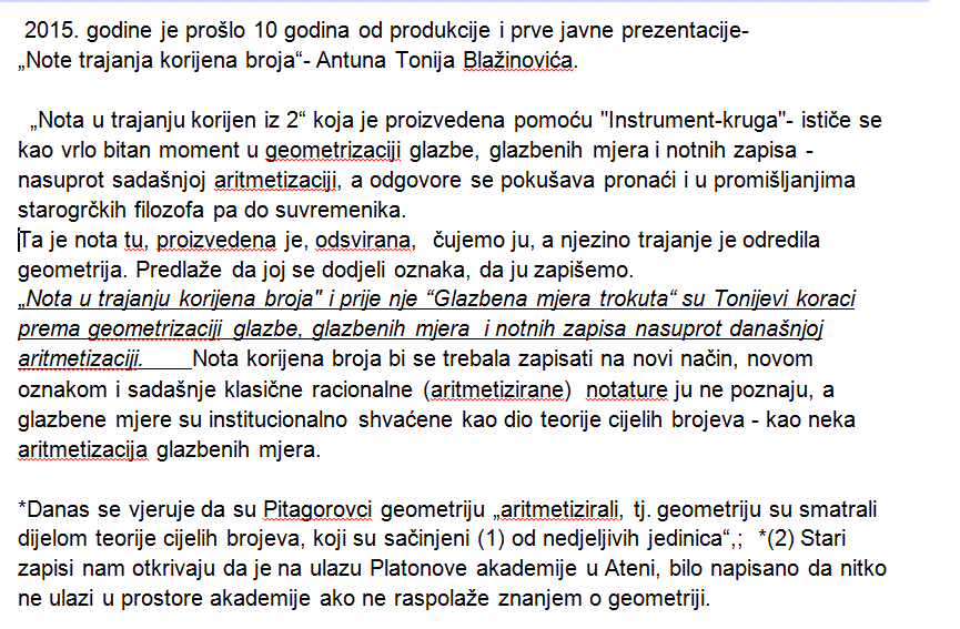 Sredinom kolovoza 2005. snimio sam svoj postupak kojim sam dobio notu trajanja korijena broja. Nota koju sam dobio ima trajanje korijen iz dva(2). Trokut dimenzija 1-1-korijen iz 2 , je bio polazna tocka. Opseg tog trokuta trebao je biti i opseg kruga. „Instrument-kruga koji sam dao naciniti. „Instrument-krugu“ sam odredio duljine lukova 1-1-Korijen iz 2. U tockama gdje lukovi pocinju postavio sam klinove koji kada se „Instrument-krug“ vrti udaraju u zvonce. Tako u jednoj rotaciji pri istoj brzini vrtnje dobijemo note trajanja: 1-1-Korijen iz 2. Pri stalnoj brzini vrtnje i tempu=60, dobijemo note trajanja 1sekunda-1sekunda i 1,414… sekunda (korijen iz dva sekunde) Prva javna prezentacija note korijena broja se desila u ZeKaeM-Zagrebackom Kazalištu Mladih, (29/11/05-ZAGREB-CROATIA).