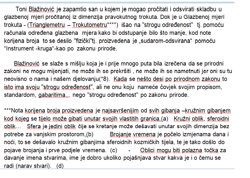 ( im Verhältnis zu jeder Dimension des Dreiecks): a/n+b/n+c/n. Die Seiten des Dreiecks (a, b, c) bestimmen die Anzahl der Zählzeiten in einem Takt und stehen im Zähler, während im Nenner die Art der Zählzeiten steht (n). Jede Seite des Dreiecks steht für einen Takt. Die Seiten des Dreiecks können addiert werden und als eine metrische Einheit innerhalb eines Taktes bestimmt werden. Bei den Dreiecken, bei denen die Dimension der Hypotenuse keine ganze Zahl beträgt, bestimmte Blažinović die Schläge durch Computerprogrammierung und kam zu kleineren Abweichungen als beim „lebendigen“ Dirigieren einer musikalischen „standardisierten“ metrischen Einheit. All dies wurde am Computer durchgeführt, so dass die Aufteilung der metrischen Einheit auf die kleinsten musikalischen metrischen Einheiten, die Zählzeiten, kein Problem darstellte, da man mit Hilfe des Computers kleinere Zählzeiten als 1/64 bestimmen kann, wie z.B. 1/128 oder 1/512 usw. Mit diesem Artikel bewegt sich Blažinović in die musikalische und kulturelle Welt, um seine Kompositionstechnik und seine musikalische metrischen Einheit bekannt zu geben, die er aufgrund der Dimensionen eines Dreiecks festgelegt hat. Kompositionen, die in dieser metrischen Einheit geschrieben werden, werden sich auf CD herausgegeben. Die Namen der Kompositionen enthalten die Dimensionen der Dreiecksseiten. Die Musikrichtung ist Elektronik/Minimalismus/Moderne.