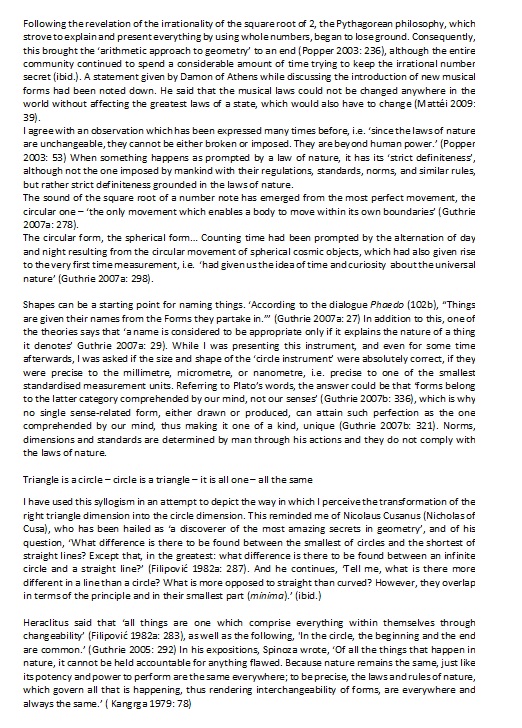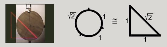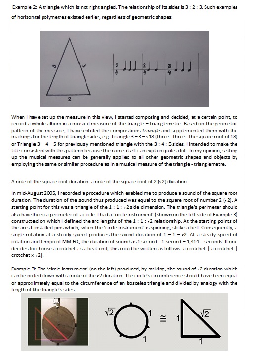 In mid-August 2005, I recorded the process whereby I realized a note whose duration could be described in terms of the mathematical square root of a number. The duration of the note I achieved was equal to the root of the number 2. The starting point for this note was a triangle with the dimensions of 1-1-root of the number 2. The circumference of this triangle was supposed to be equal to the circumference of a circle – the “circle-instrument“ which I had made.