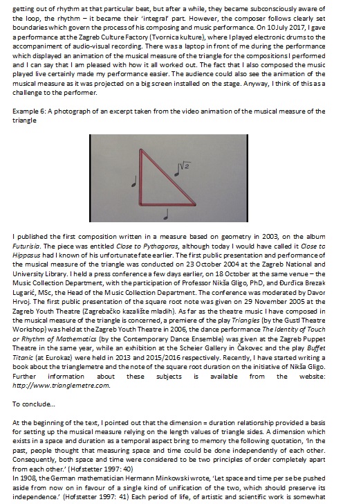 In those triangles in which the dimension of the hypotenuse is not a whole number, he has determined the beat by computer programming and arrived at a smaller deviation than with the live conducting of some of the standard musical measures. Everything has been done on a computer, and accordingly the problem of the division of the measure into the smallest musical units – beats – did not constitute a problem, since with a computer it is possible to define beats of less than 1/64, for example, 1/128 or 1/512 and so on.