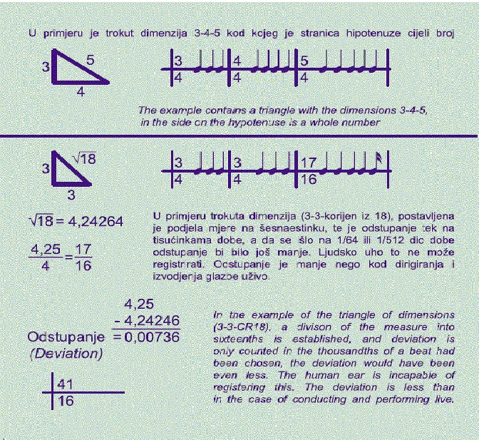 In those triangles in which the dimension of the hypotenuse is not a whole number, he has determined the beat by computer programming and arrived at a smaller deviation than with the live conducting of some of the standard musical measures. Everything has been done on a computer, and accordingly the problem of the division of the measure into the smallest musical units – beats – did not constitute a problem, since with a computer it is possible to define beats of less than 1/64, for example, 1/128 or 1/512 and so on.