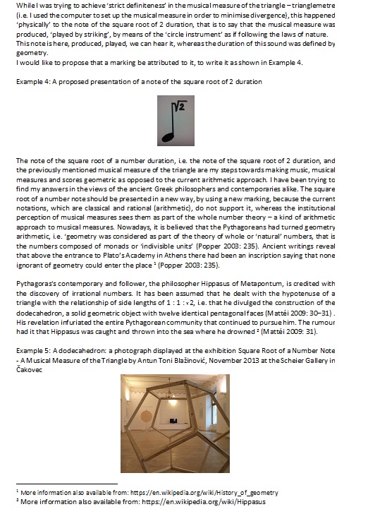 Sredinom kolovoza 2005. snimio sam svoj postupak kojim sam dobio notu trajanja korijena broja. Nota koju sam dobio ima trajanje korijen iz dva(2). Trokut dimenzija 1-1-korijen iz 2 , je bio polazna tocka. Opseg tog trokuta trebao je biti i opseg kruga. „Instrument-kruga koji sam dao naciniti. „Instrument-krugu“ sam odredio duljine lukova 1-1-Korijen iz 2. U tockama gdje lukovi pocinju postavio sam klinove koji kada se „Instrument-krug“ vrti udaraju u zvonce. Tako u jednoj rotaciji pri istoj brzini vrtnje dobijemo note trajanja: 1-1-Korijen iz 2. Pri stalnoj brzini vrtnje i tempu=60, dobijemo note trajanja 1sekunda-1sekunda i 1,414… sekunda (korijen iz dva sekunde) Prva javna prezentacija note korijena broja se desila u ZeKaeM-Zagrebackom Kazalištu Mladih, (29/11/05-ZAGREB-CROATIA).