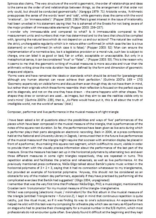 In those triangles in which the dimension of the hypotenuse is not a whole number, he has determined the beat by computer programming and arrived at a smaller deviation than with the live conducting of some of the standard musical measures. Everything has been done on a computer, and accordingly the problem of the division of the measure into the smallest musical units – beats – did not constitute a problem, since with a computer it is possible to define beats of less than 1/64, for example, 1/128 or 1/512 and so on.
