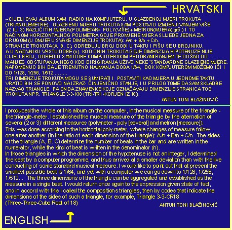 ( im Verhältnis zu jeder Dimension des Dreiecks): a/n+b/n+c/n. Die Seiten des Dreiecks (a, b, c) bestimmen die Anzahl der Zählzeiten in einem Takt und stehen im Zähler, während im Nenner die Art der Zählzeiten steht (n). Jede Seite des Dreiecks steht für einen Takt. Die Seiten des Dreiecks können addiert werden und als eine metrische Einheit innerhalb eines Taktes bestimmt werden. Bei den Dreiecken, bei denen die Dimension der Hypotenuse keine ganze Zahl beträgt, bestimmte Blažinović die Schläge durch Computerprogrammierung und kam zu kleineren Abweichungen als beim „lebendigen“ Dirigieren einer musikalischen „standardisierten“ metrischen Einheit. All dies wurde am Computer durchgeführt, so dass die Aufteilung der metrischen Einheit auf die kleinsten musikalischen metrischen Einheiten, die Zählzeiten, kein Problem darstellte, da man mit Hilfe des Computers kleinere Zählzeiten als 1/64 bestimmen kann, wie z.B. 1/128 oder 1/512 usw. Mit diesem Artikel bewegt sich Blažinović in die musikalische und kulturelle Welt, um seine Kompositionstechnik und seine musikalische metrischen Einheit bekannt zu geben, die er aufgrund der Dimensionen eines Dreiecks festgelegt hat. Kompositionen, die in dieser metrischen Einheit geschrieben werden, werden sich auf CD herausgegeben. Die Namen der Kompositionen enthalten die Dimensionen der Dreiecksseiten. Die Musikrichtung ist Elektronik/Minimalismus/Moderne.